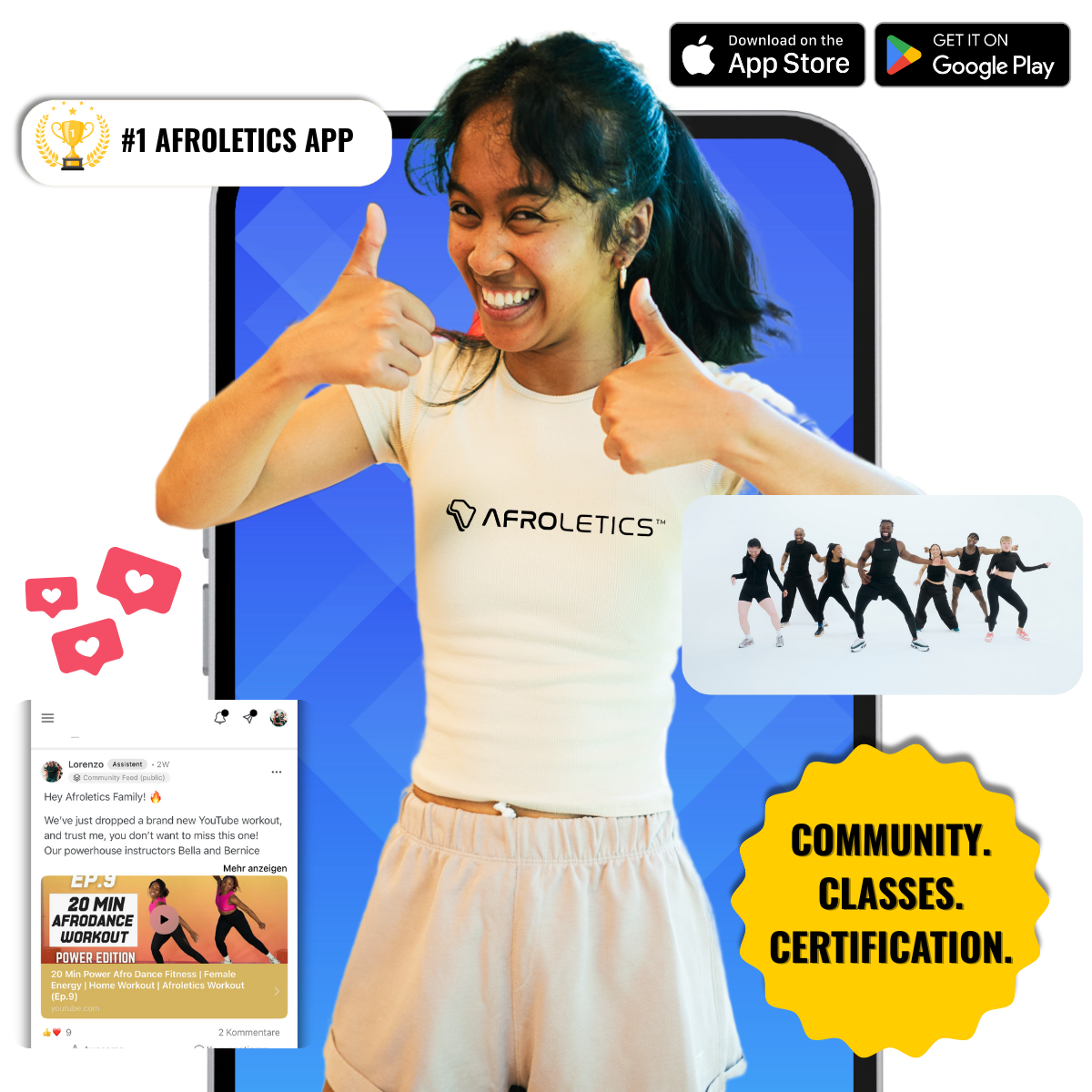Afroletics App Join the Afroletics Community App and connect in our built in message boards. Share posts, ask questions and exchange with instructors and members, watch certification videos and stay up to date with classes and events.
